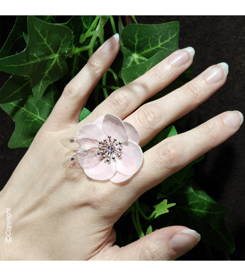 Cette Bague réglable en plaqué argent est ornée d'une fleur en tissu flexible et d'ailes de Fée flexibles.