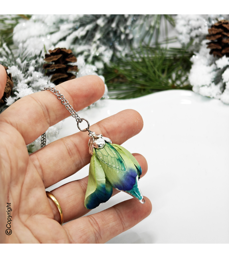 ✨ Cette création est ornée d'une aile de Fée flexible, d'une fiole en verre contenant de la poudre phosphorescente recouverte de pétale de fleurs en tissu.