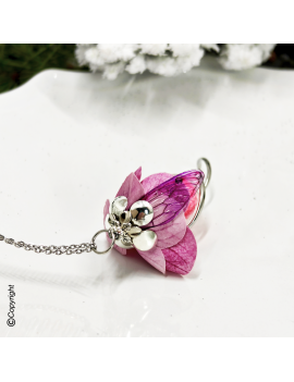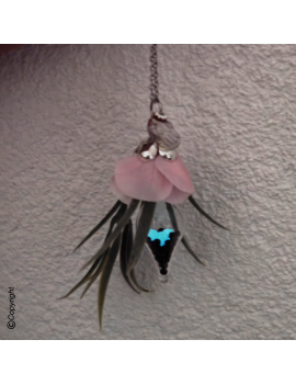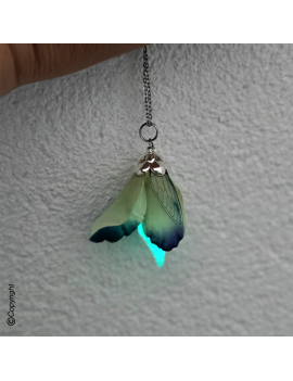 ✨ Cette création est ornée d'une aile de fée flexible, d'une fiole en verre contenant de la poudre phosphorescente recouverte de pétales de fleurs en tissu.