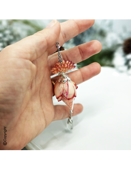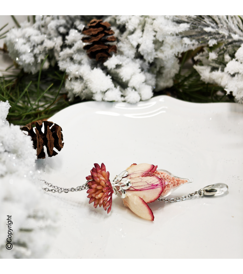 ✨ Cette création est ornée d'une aile de fée flexible, d'une fiole en verre contenant de la poudre phosphorescente recouverte de pétales de fleurs en tissu.