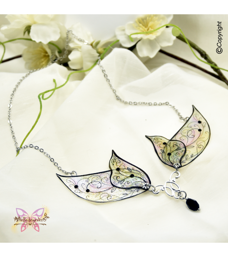 I took inspiration from the fairy world to create this jewel with iridescents fairy wings and crystals.