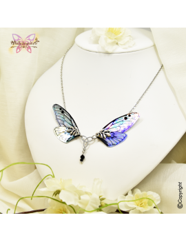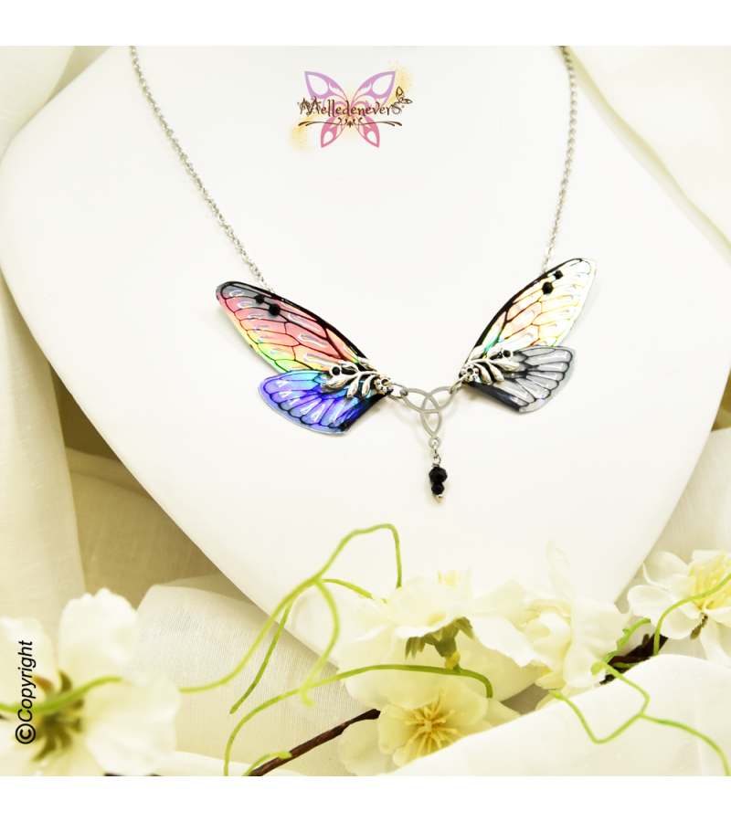 I took inspiration from the fairy world to create this jewel with iridescents fairy wings, crystal and celtic triquetra.