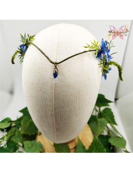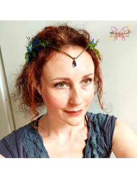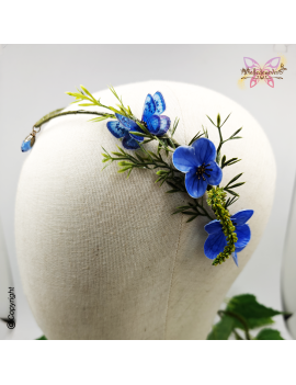 Adjustable reversible tiara of the Nymphs with blue hydrangea flowers and Maculinea butterflies.