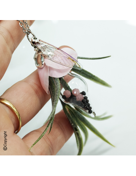 ✨ This creation is adorned with flexible fairy wings, a glass vial containing seeds and phosphorescent beads covered with fabric flower petals and twigs.