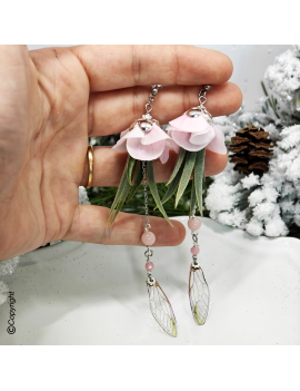 ✨ This creation is adorned with flexible fairy wings, phosphorescent pearls covered with fabric flower petals and branches.
